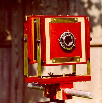 Donald Booth in San Francisco has built a beautiful camera based on the design in Building a Large Format Camera. He used padouk and figured maple for the outer frames and the lensboard, and cocobolo for the connectors. The inner frames are mahogany. Don will be using the camera mostly for still life and portrait and decided to modify the swing and tilt layout.