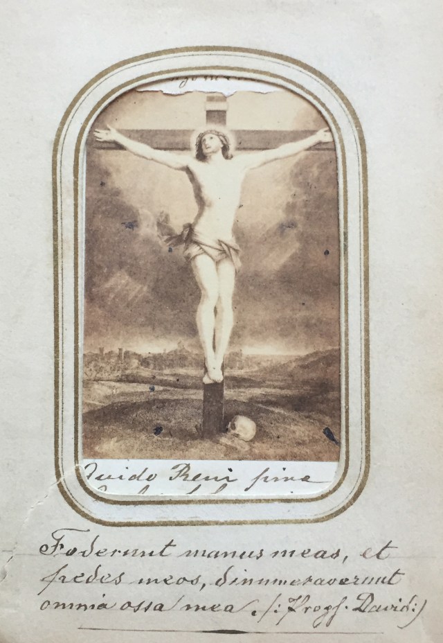 Første biletet er Guido Renis skildring av Kristi krossfesting over høgalteret i kyrkja San Lorenzo in Lucina i Roma. Teksten er henta frå Davids salmar i Vulgata: «Foderunt manus meas et pedes meos, dinumeraverunt omnia ossa mea.» Dei har gjennombora mine hender og føter, dei har talt alle mine bein.