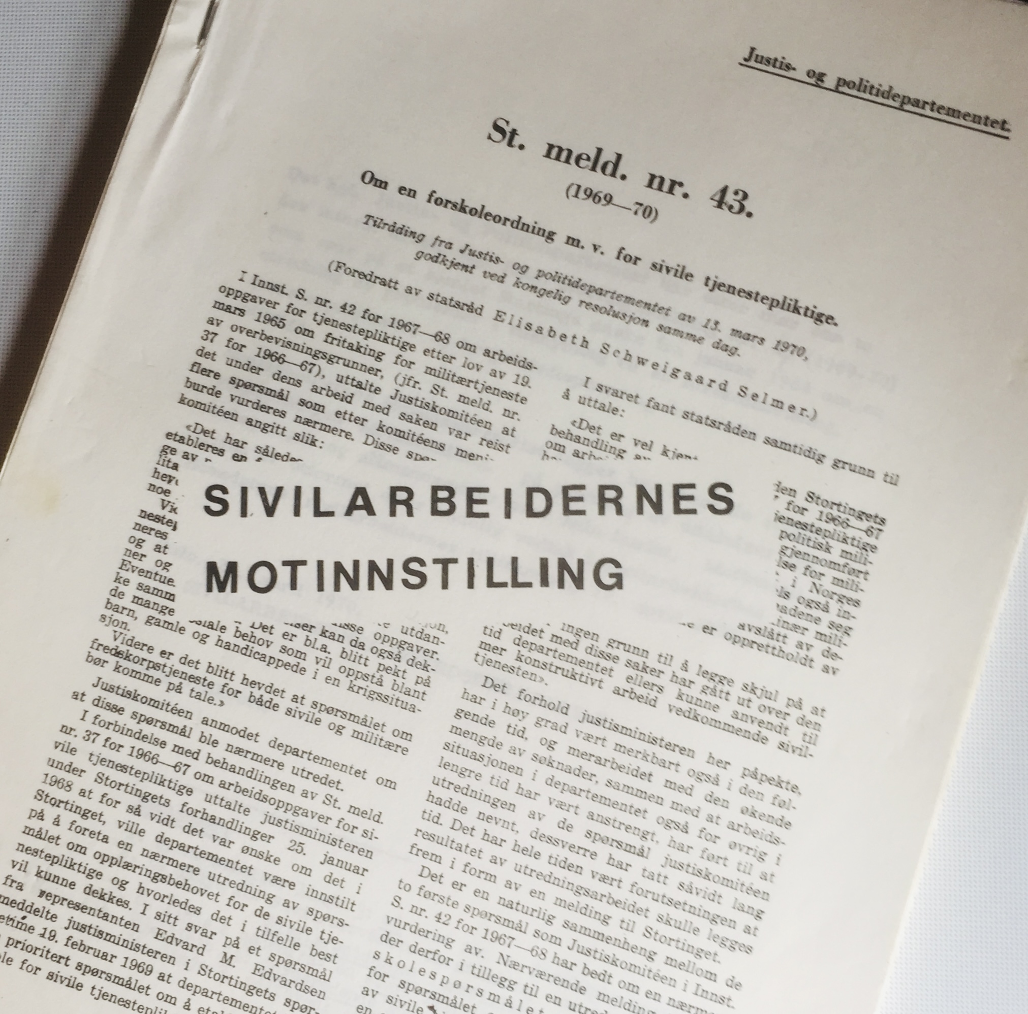 Sjølv gjorde eg sivilteneste i 1969–70, først på avdeling H på Nærlandsheimen på Nærbø, ei avdeling for psykisk utviklingshemma og sikringsfangar, så hos Edvard Vogt på Seletun, og den siste tida på Forskulekontoret i Oslo, eit kontor som var med og førebudde forskulen for sivile tenestepliktige.